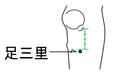 右図「足の三里」(膝の外側直下の小さなくぼみから指4本分下 )