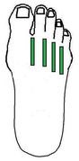 「腎臓ゾーン」 (第二、第三中足骨の近位端でリスフラン関節線の上)